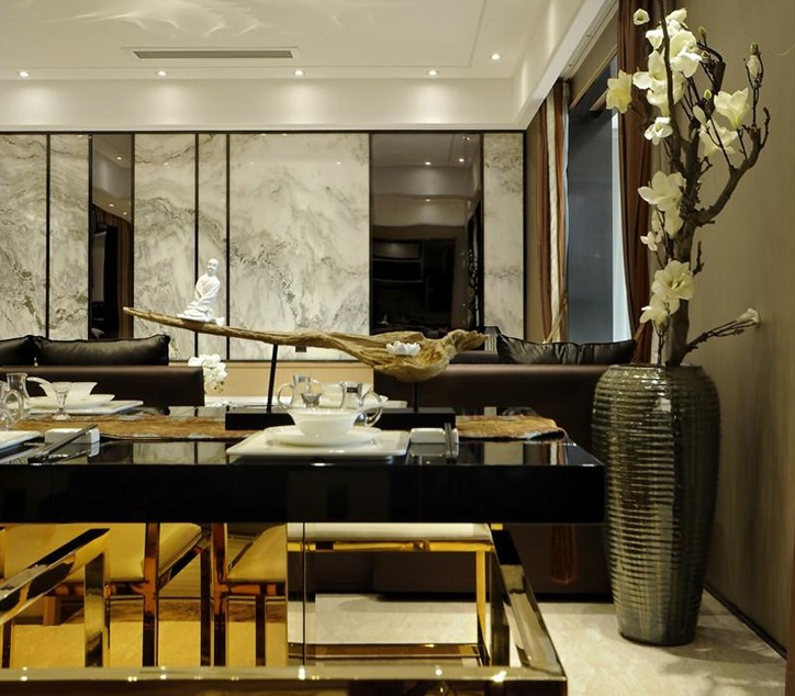 餐厅中金属元素较多。珊瑚金色温润高雅,蕴含的活力带给人无穷的力量和温暖,除了高贵以外,更多了一份亲近......