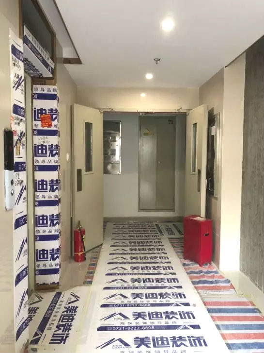 这次我们探访的工地是国泰九龙湾,现场制作柜体已完成。小美一进门,就看到贴有美迪装饰专用的保护膜,这属于成品保护。