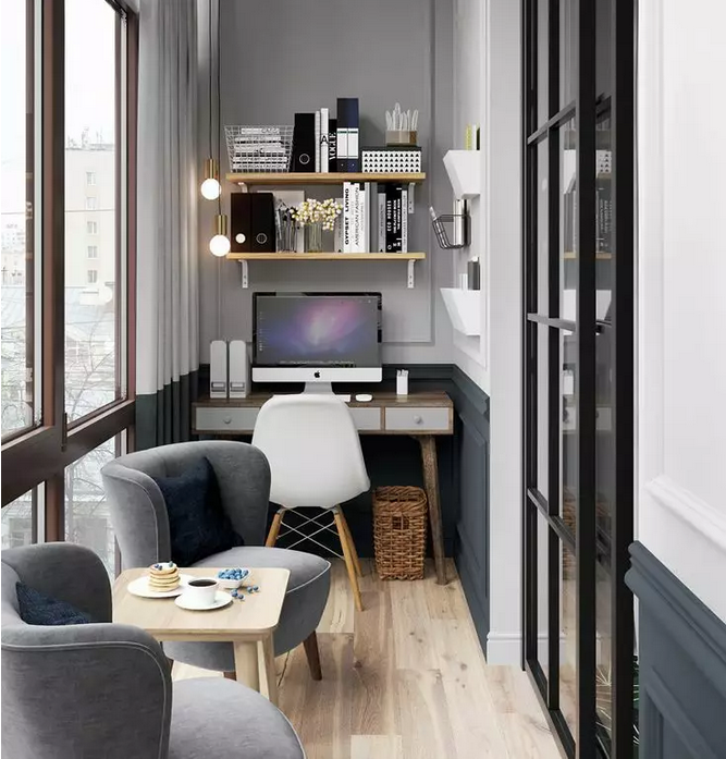 如果空间实在不允许,阳台也可以用窗帘来当隔断,为了保护隐私和调节光线,窗户可以选择用可以调节光线的百叶窗,任意调节自然光线在室内的明暗程度。