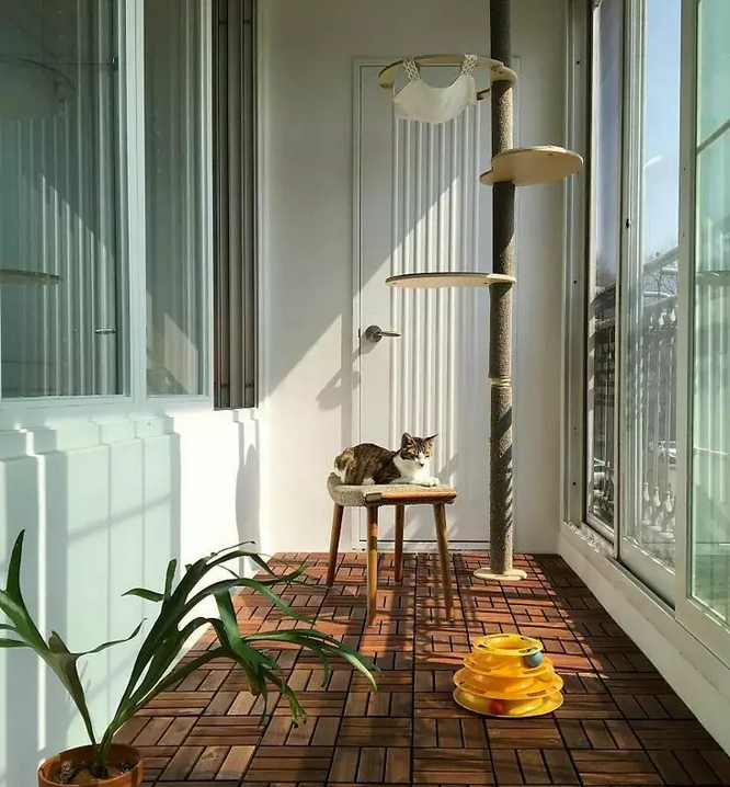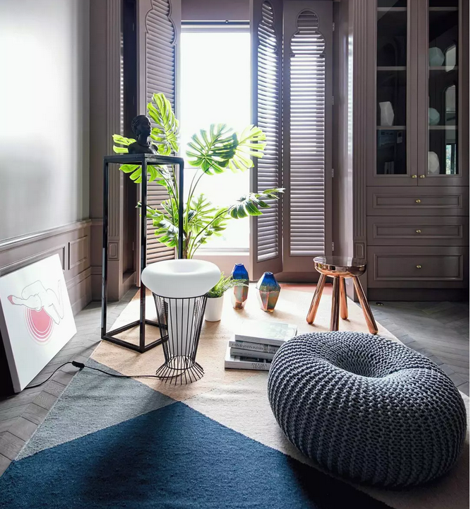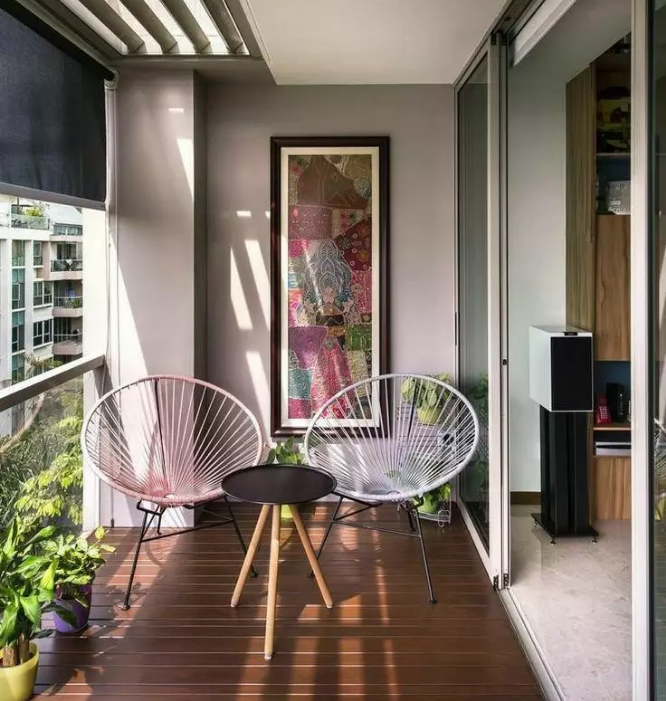 如果阳台所在的空间不大,又想有个独立的空间,用来休息或冥想或静静发呆,可以用窗户+一扇玻璃门来做空间的隔断,即通透却又能保障阳台区域的私密性。