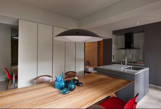 蓝色花瓶、红色座椅、浅灰色的吊灯也让家变得跳动起来了。