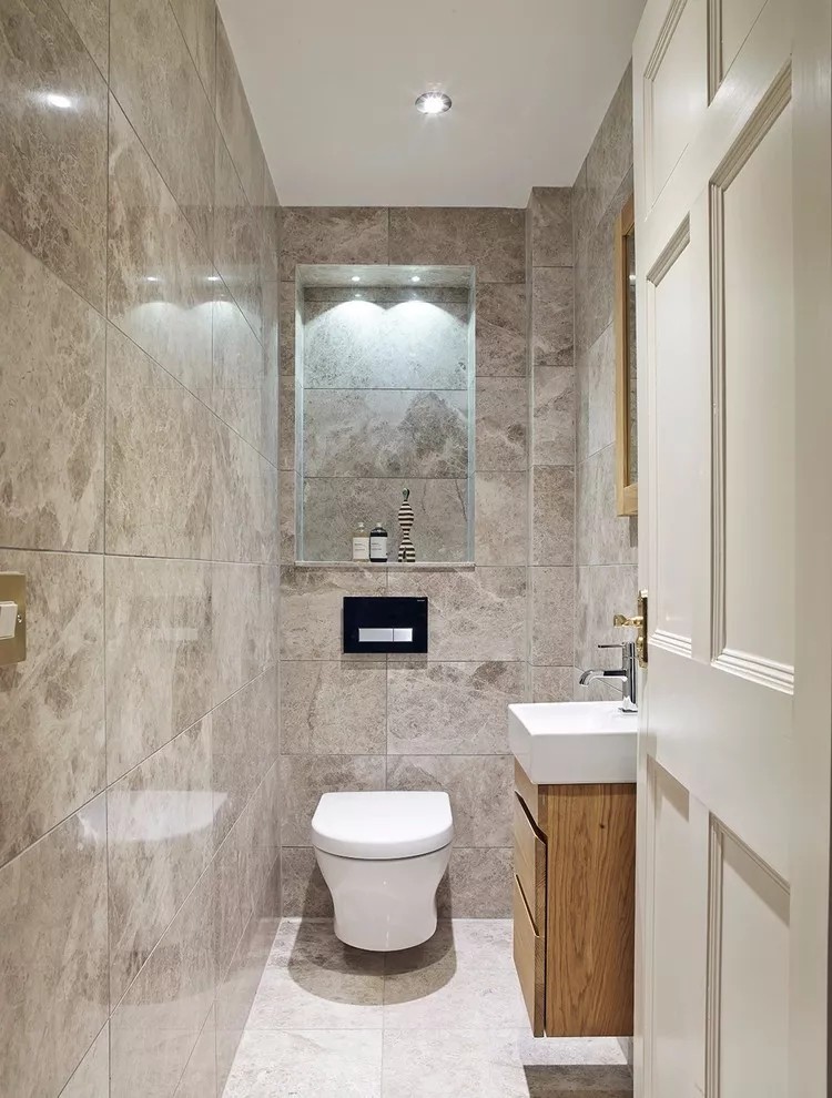 长方形的卫生间可以像下面这样布局,遵循了逐步深入的布置法。
