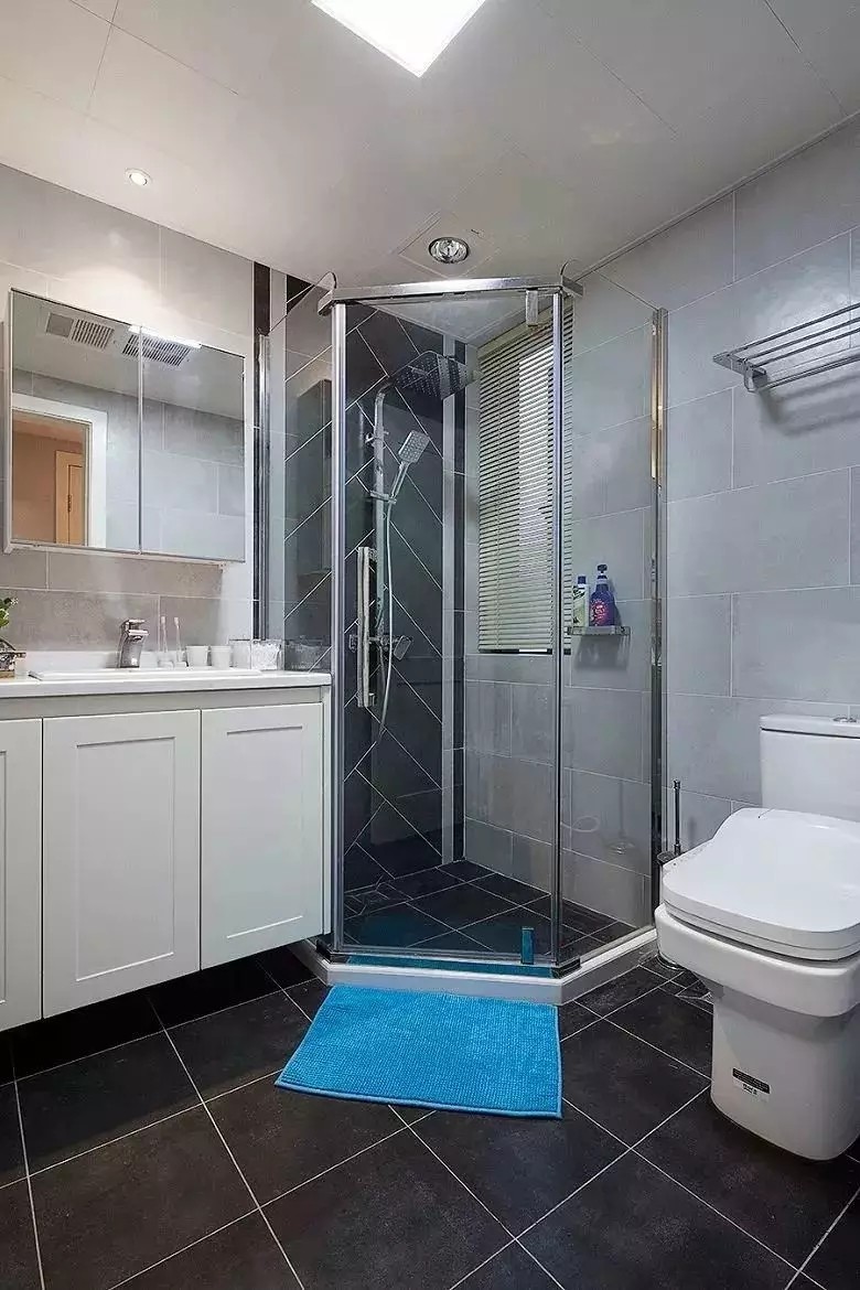 考虑到圆弧形的玻璃隔断造价较高,而由三块玻璃拼接而成的钻石型淋浴房就是个折中的选择。