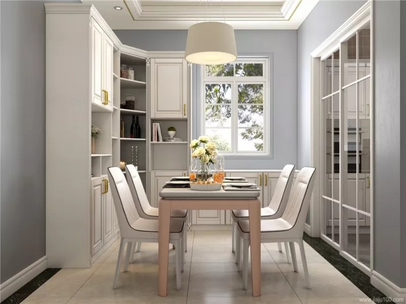 有些很小的户型,连餐厅都放不下4张餐椅,这种情况餐边柜又能派上用场了,餐边柜改变以往的形式,加上卡座的功能,不仅可以收纳,还可当做餐椅来用,一举两得,这种设计比多放置两张餐椅更省空间。