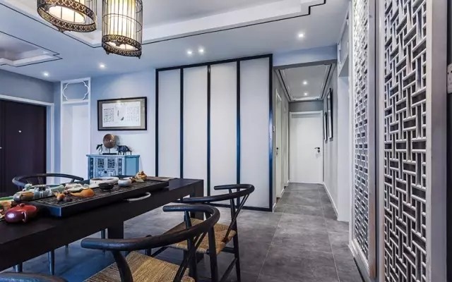 4.玻璃:玻璃在工艺的不断进步下,也变得越来越丰富,颜色、花纹越来越多,装饰效果也越来越好。在简中式设计中,常用于隔断中,因为玻璃有透光性,能让家居更加光亮,又起到间隔作用。