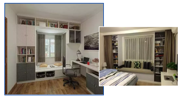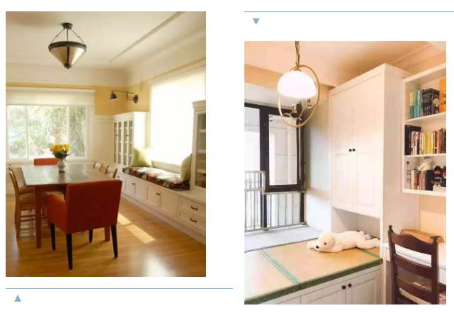 平凹的内飘窗设计由于占用了较大的室内空间,我们可以在两侧的墙面上下功夫,安排收纳柜,提高收纳机能。