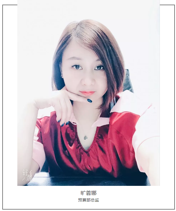 初见旷蓉娜总监的时候,给人感觉特别热情亲切,浑身散发着自信与独立的女性特质,旷总从事预算行业已经有12年了,生活中也已经是一个小女孩的妈妈。热爱生活,兴趣爱好广泛,唱歌,打球,健身,爬山样样都能来,她说自己的团队有很多90后,自己比他们大很多,但她无论是外表还是心态都散发着年轻活力。
