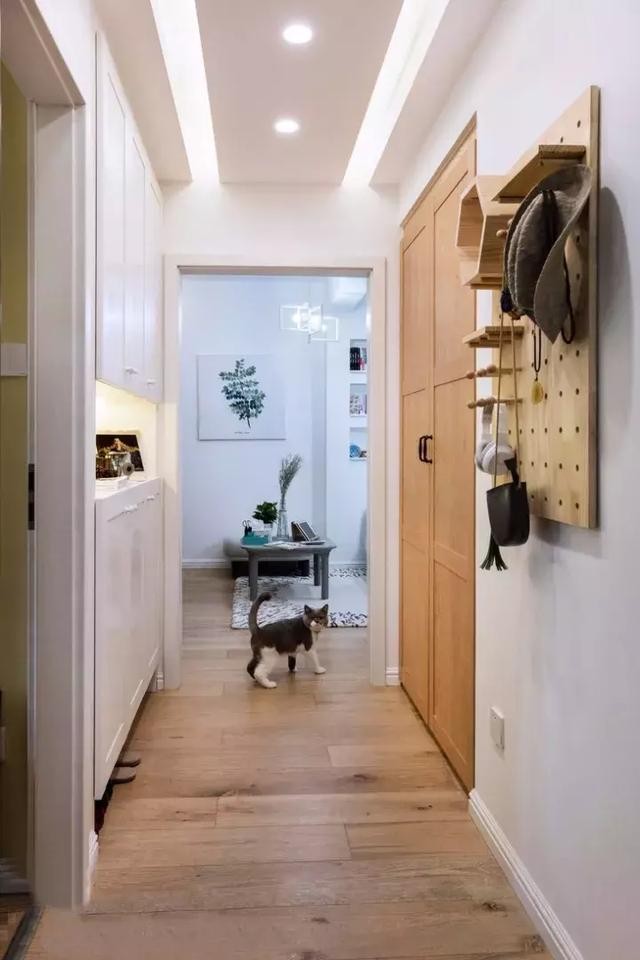▲玄关处设计了衣帽贵、储物柜和鞋柜,方便进出门的衣服换穿,隐形灯有整体照明的效果。