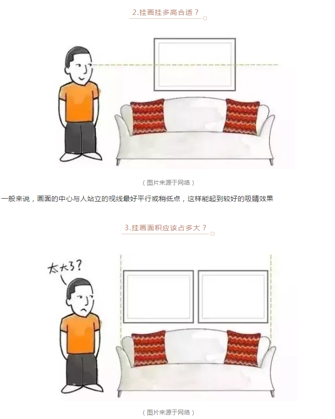 当然,挂画的排列组合不是一件简单的事情,但也有一些约定俗成的技巧,大家可以参考下图