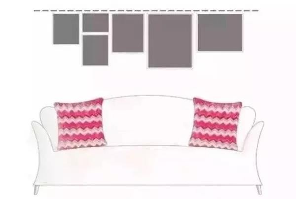 如果占参照物面积比例过大,会显得头重脚轻,过小则会显得小气。如以沙发为参照物,建议挂画的组合长度可以取沙发总长的黄金比例0.68,即挂画总长度=沙发总长度x0.68