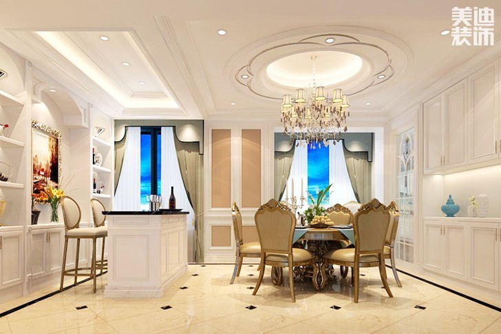 中心色为柔和的粉红色。地毯、灯罩、窗帘用红加白色调,家具白色,房间局部点缀淡蓝,有浪温气氛。