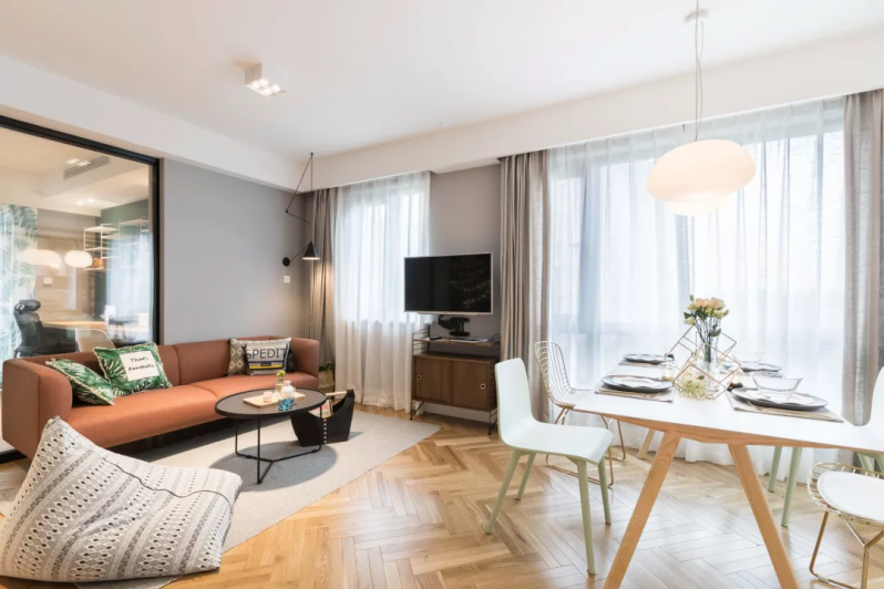 客餐厅之间没有做隔断,可伸缩和旋转的电视被摆放在了两个空间的中间,方便随时进行调整,不管是在客厅还是餐厅都能更好的观看电视。