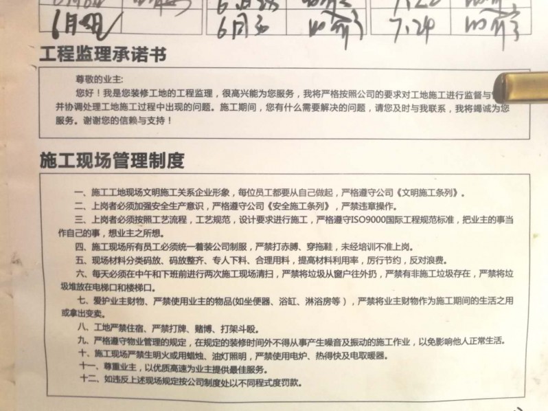 一上楼就发现门上挂着施工规范和装修日记,每天都有施工记录,标注得非常清晰,施工工人和项目负责人对工地的认真负责的态度让人安心。