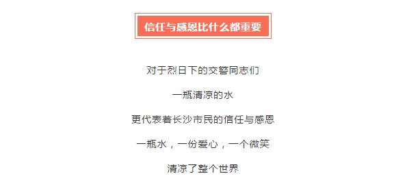 我们的工作人员走出办公楼,走上街头,为高温下辛苦工作的环卫工人、交警同志、外卖小哥及快递小哥以及所有城市高温工作者送上水,在炎热的夏季为他们送上一丝清凉,更向他们表达湖南美迪装饰联合长沙交警、中粮可口可乐华中公司、腾讯·大湘网和金鹰955的敬意。