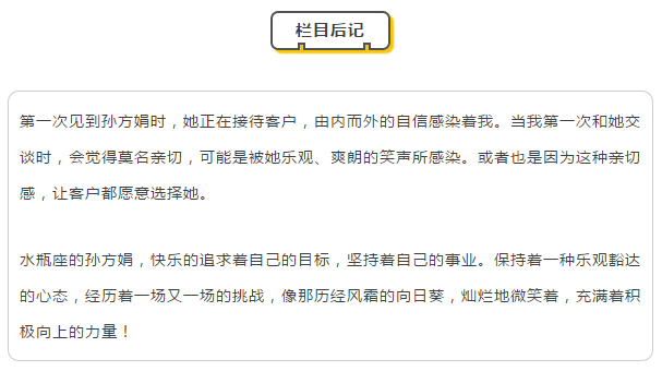 同时,在网销部小伙伴们的心中,孙方娟是一个对客户有激情的人,“无论什么时候,她都面带笑容,对工作踏实、认真、充满耐心,是位极其优秀的客服经理。我们把客户交给她等于是买了份保险,很放心”。