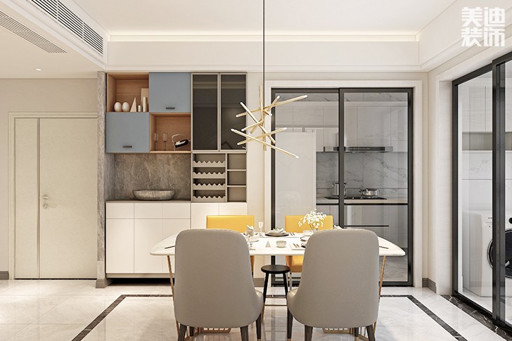 中岛吧台的设计有3大作用:1.它是收纳厨具的好地方;2.是客厅、厨房之间的隔断;3.还作为吃饭的餐桌。