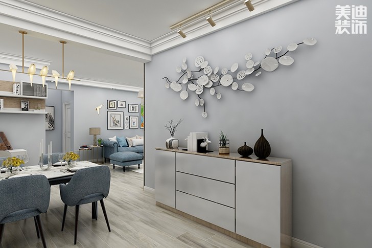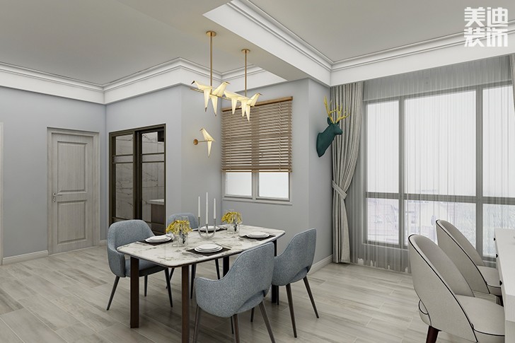 简单的大白墙,在加上格子布沙发与蓝色的点缀,很好的中和了工业风格装修的冷清。餐厅上方是黑色水管灯酷感十足,白色餐桌椅选用纤细的造型,展现出工业风细腻的一面。
