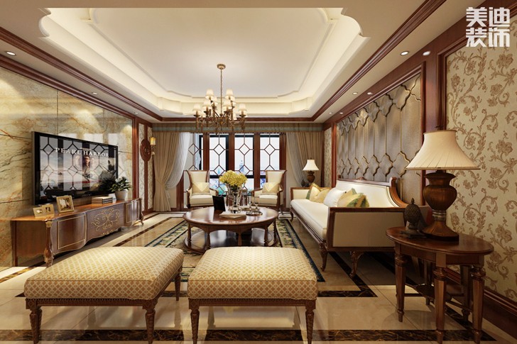 客厅设计具有美式风格的大气典雅,同时带有些许时尚简约感,空间以原木色为主调,搭配米色的家居装饰,营造出精致、清爽的空间氛围。