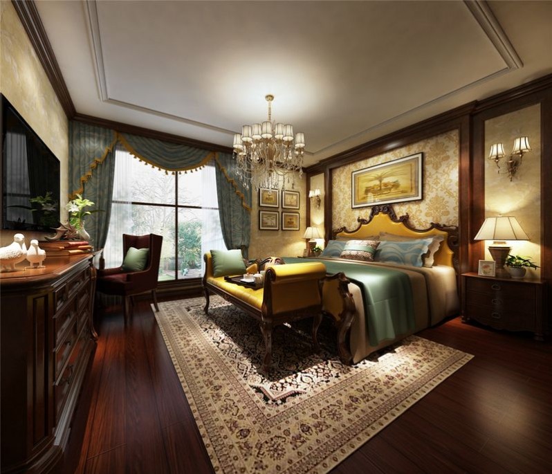 黄色印花墙布和浅蓝印花窗帘,使主卧室氛围愉悦而温馨,精致雕刻的实木电视柜更显别致,体现着温婉与雅致品位。