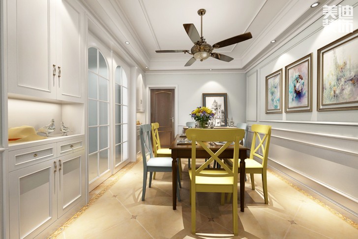 本案例中,客餐厅主色调运用了高级灰和温馨黄色搭配,是艺术对视觉上的征服,视觉对艺术学的完美诠释,过度的颜色很好的划分了区域问题。