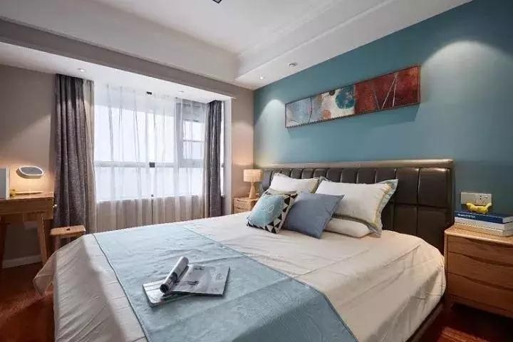 蓝色背景墙抛弃了小清新调,更显成稳低调,深灰色软靠搭配白色床品,轻奢格调满满,让人不由得想象出一幅画:精致慵懒的贵族公子坐在床上,翻看着手中的书籍或者嘴里叼一根烟,吞云吐雾,制造丝丝“仙气”。两边的床头柜是浅木色,斑驳的纹理,更显原始味,也让整个主卧更加舒适,充满暖意。