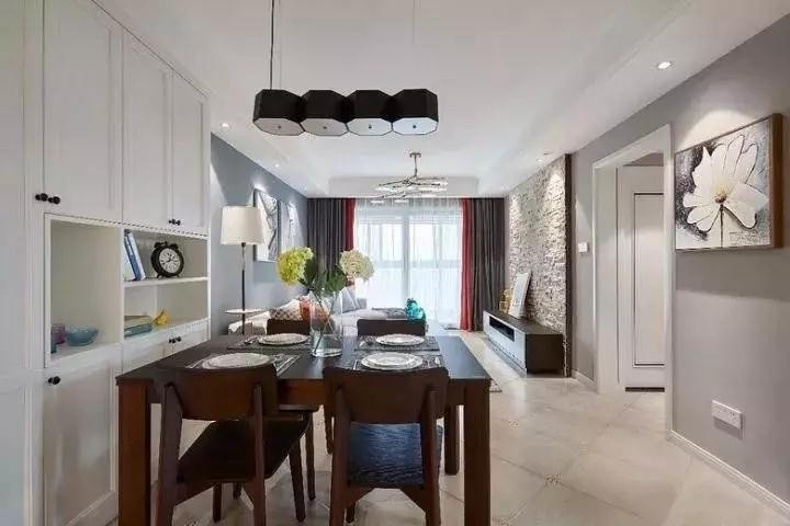 餐厅一边背景墙用浅灰色乳胶漆装饰,搭配素净的花朵装饰挂画,自然干净,看着非常舒服,餐桌选择了偏美式复古风的深咖色,搭配同色系餐椅,显得厚重而古朴,质感而有力度,餐边柜与玄关柜合并在一起,入顶式设计,自然大方的白色,与深色互补,不会让人忽视其中一处。