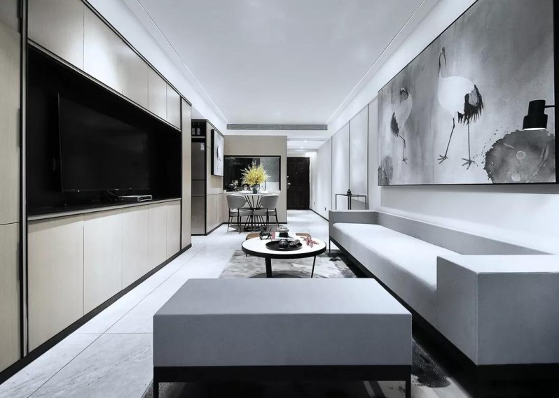 沙发背景墙的装饰画,黑白灰色调的仙鹤装饰画,与泼墨地毯有呼应的效果,是中式元素的现代化。