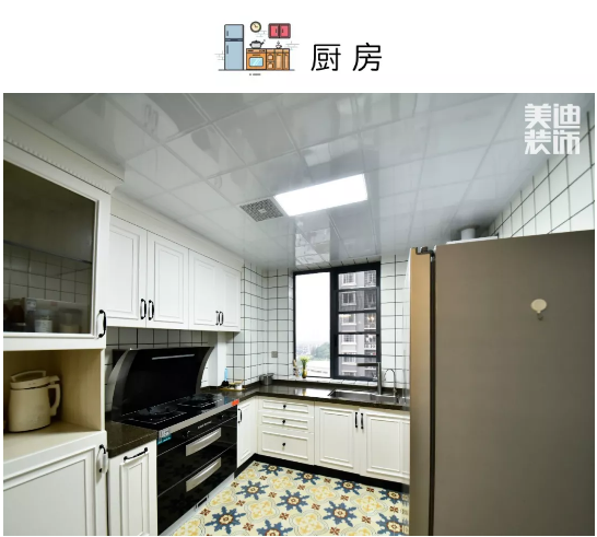 美式厨房,简洁明亮,厨房地面通铺花砖,立面小白砖搭配白色橱柜,深色麻点台面耐脏易打理。