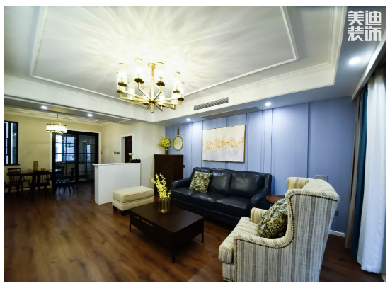 浅蓝色背景墙与墨蓝色皮沙发呼应却又有区别,层次美才是最高级的美。