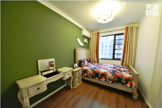 次卧居住的是男主人和女主人,选用绿色调作为床头背景,多了一份清爽和生动,给人宁静舒缓的感受。床头柜旁放置了梳妆台,增添空间机能,床头的羽毛装饰点亮了整个卧室,美得很有特色也很有个性。