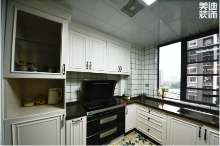 原本的餐厅空间过于狭小,因此牺牲了卫生间的一点空间,增加了厨房的操作空间,L字型的地柜与吊柜让厨房没有收纳的困扰。