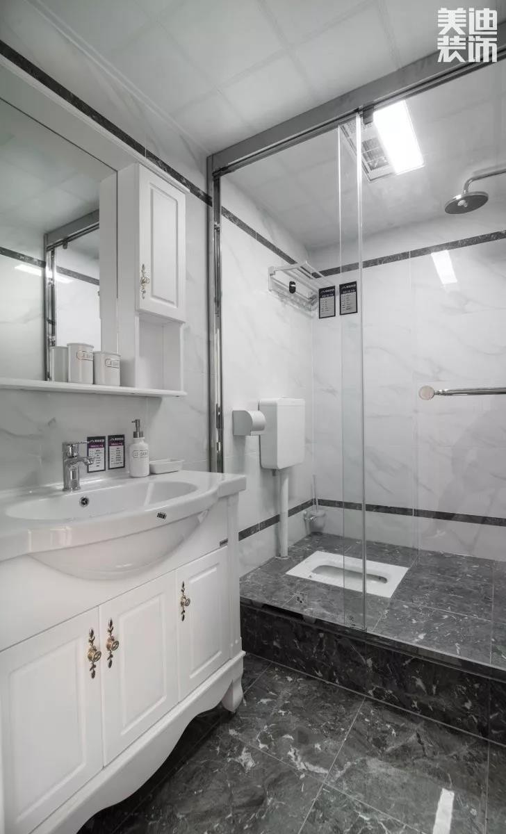 浴室虽说面积不是太大,但干湿分离一定要做。我们可以考虑借助浴帘亦或者淋雨门来达到我们干湿分离的效果,这样也不会太过占据浴室的空间。