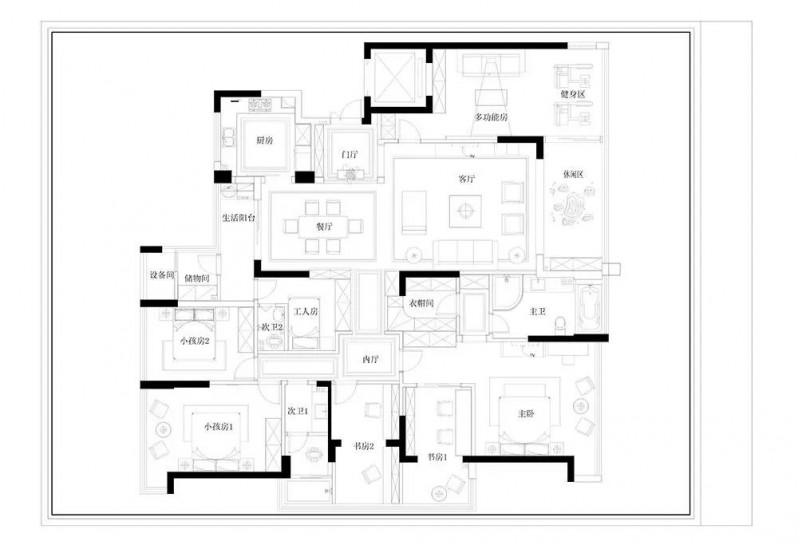 户型本身是一个250平的平层,餐厅、工人房实际使用面积很小,主卧衣帽间和洗手间不能干湿分区,储物空间小,而过道、阳台面积太多,使得原户型空间零散,因家里有两个小孩,业主希望将小孩书房和大人书房分开,增加储物空间不足的问题。