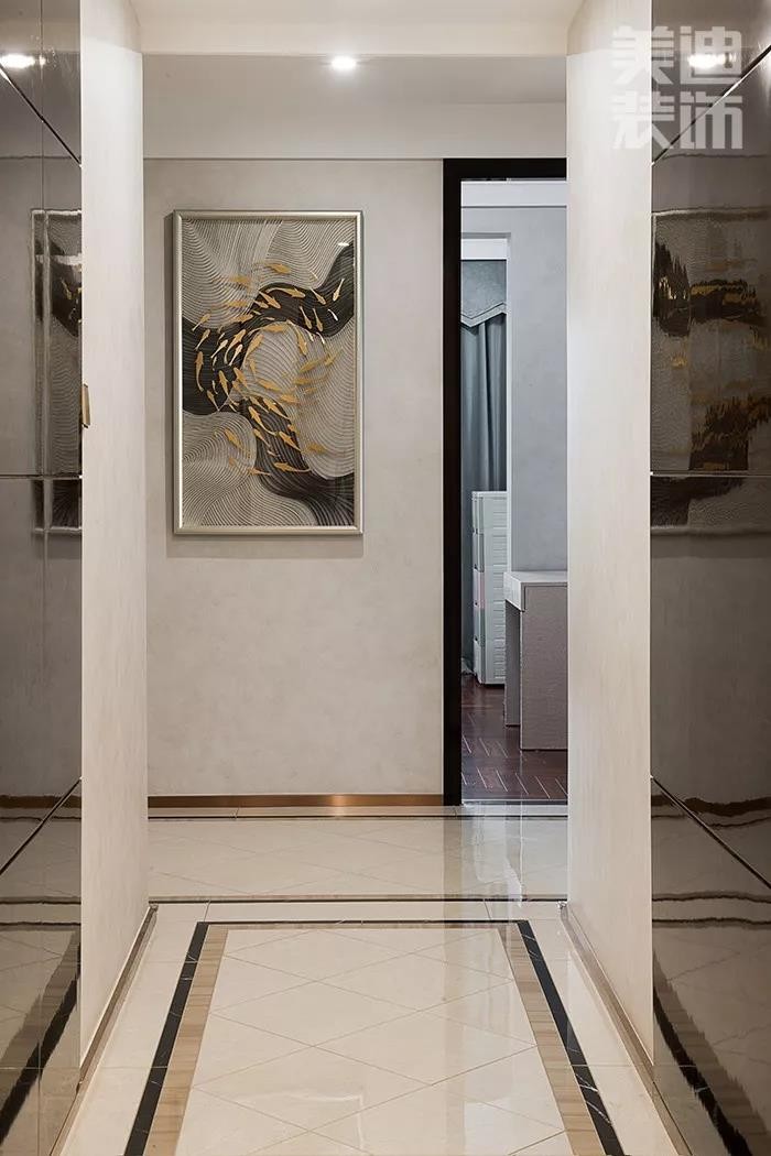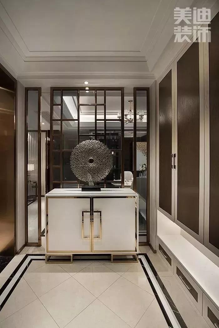 本次案例精彩的地方推开门就能看到,与餐厅连接的墙面特地做了一个镂空的金属隔断,从而延伸了餐厅的空间,尽头放置精致高雅装饰柜,整体生动且时尚别致,强大的收纳设计使整体实用且明亮宽敞。