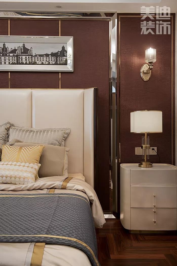 主卧室采用了暖色系,巧妙的加入金属材质、卡其色元素,实木拼接地板,线条简单的家具,错落有序,营造出一个温馨舒适的休息空间。