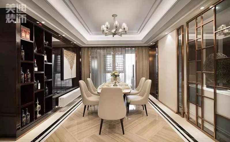 餐厅选用了与整体协调的色系,隐藏式酒柜和造型墙融为一个整体,既美观又实用, 深与浅的色调对比,摩登气息十足,每一处细节都出女主人温柔优雅。