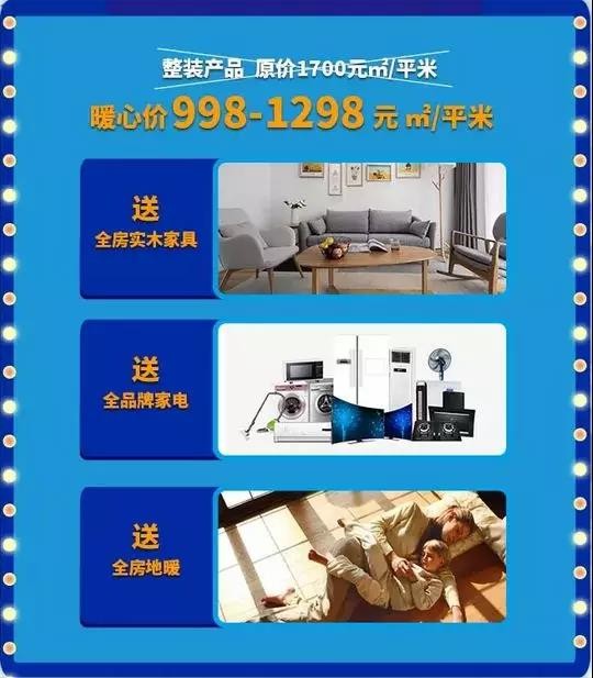包人工、进口基材、大牌主材,送全房实木家具、品牌家电、灯具,原价1700元/㎡,活动价仅需998-1298元/㎡,拎包就能入住新家。再送全房暖气,每户最高可省8万元,全年度优惠力度最大!