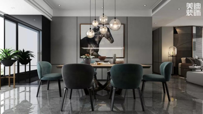 本案是一套面积为120平米的现代轻奢风格三居,整体以高级灰色调为空间的主轴线,贯穿每个空间,孔雀绿的点缀赋予了空间层次感与轻奢感,冷静低调而优雅简约。