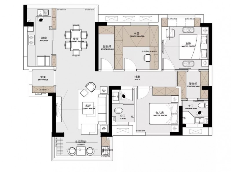 本案空间北面的空间划分改动不比较大,北边小阳台两边墙体拆除,餐厅外扩,阳台空间全部纳入到餐厅,借用了厨房墙体空间制作酒柜,客厅南面的大阳台我们直接把他归纳到了客厅的公共区域,增加了客厅的采光及空间。