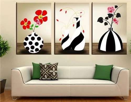 如果您不想采用太过复杂的装饰画,不妨来一点小清新的,客厅背景墙上悬挂三幅以花瓶、鲜花为主题的装饰画,配上白色简约款的沙发,将客厅装扮的格外的清新、淡雅,别有一番滋味。
