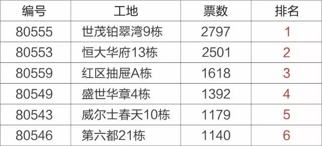 其中处于泥工施工阶段的有8055号世茂铂翠湾9栋、80543威尔士春天10栋;处于水电施工阶段的有80553恒大华府13栋、80559红区抽屉A栋;处于油漆施工阶段的有80549盛世华章4栋、80546第六都21栋。各工地可谓各有千秋。如果你想浏览这些工地“佼佼者”,可在投票页面搜索相应的编号即可。