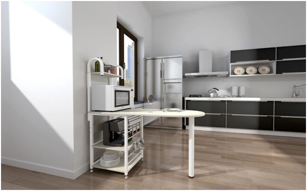 厨房地下面积有限,所有我们要进行“扩容”。在地面区放置多层的置物架,尽量把物品一层层地往高处放,例如微波炉,平底锅、闲置的餐具都能放在这里,储物量相当惊人。