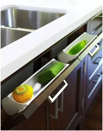 很多人觉得水槽不便于收纳,其实不然。在洗碗槽边上做个小小的拉柜,装两个凹槽用来放洗碗布、海绵等洗涤用品,美观又便利。
