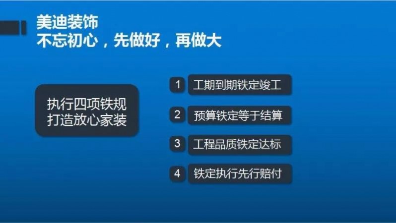 水电维系着整个家庭日常生活的运转。水电没装好,轻则电路短路、跳匝,重则水管爆裂拆了要重新装。如果您完全没时间全程监控装修质量和进度,那选择一个严格保证质量与施工品质的公司至关重要。美迪装饰,放心家装,四项铁规(期到期铁定竣工、预算铁定等于结算、工程品质铁定达标、铁定执行先行赔付),我们一直都在做放心家装这件事,把消费者对家装的‘担心’变成‘放心’。