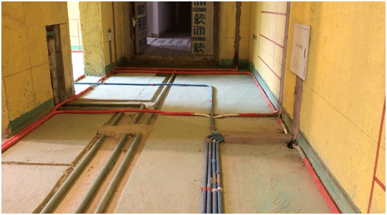 进入室内,因是水电工程阶段,最显眼的就是各种横平竖直的管道了。根据管道红、蓝