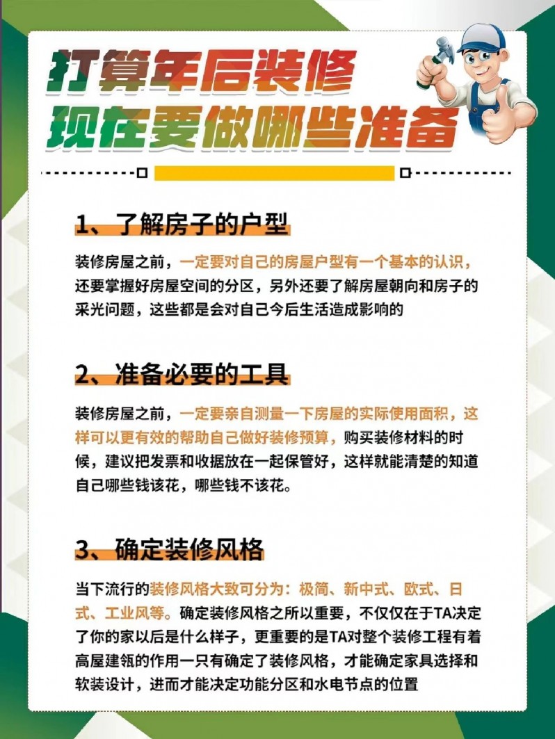 总之,如果大家准备年后就开工装修的话,一定要做好提前准备,尽可能的避免装修时因准备不足而犯错!