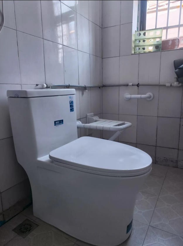 卫生间腐蚀木门更换为无障碍铝合金平开门,同时完成了水路与电路的改造。地面铺设了防滑地砖,还配备了防滑垫;新增的悬空式洗漱柜既节省空间又方便清洁。新安装的坐便器旁还安装了一字扶手、折叠淋浴椅,让老人如厕、淋浴时都能获得稳稳的支撑。